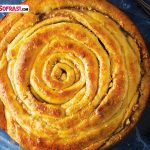 - Hamuru 5 cm x 55 cm’lik 6 eşit şeride bölün. Bir şeridi sıkıca yuvarlayıp, başka bir şeridin ucunun üstüne koyup tekrar yuvarlayın. Büyük bir sarmal oluşturana kadar aynı işlemi tekrar edin. Pişirme kağıdı serdiğiniz 20 cm’lik bir kelepçeli fırın kabına yerleştirin. Streç filmle kaplayıp 30 dakika kabarması için bekletin.