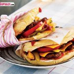 - Bazlama ekmeğini tost makinesinde bastırmadan hafifçe ısıtın. İçine ızgarada kızarttığınız köfteleri, dilimlenmiş domatesleri, kızarttığınız patatesleri, turşuları, çedar peynirini, ketçap ve hardalı ekleyerek tamamlayın.