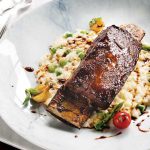- Tabağa risottoyu, pişirilen kaburgayı ve bir yerde çektirilen soya sos ve bal ile hazırladığınız sosu kaburganın üzerine koyup, domates ve arpacık soğan ile süsleyip servis yapın.