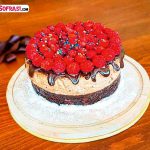 - Çikolataları bir kaseye alıp benmari usulü eritin. Biraz ılınması için bekletin. Bu sırada soğuk kremayı pudra şekeri ile birlikte iyice köpürene kadar çırpın. Çikolata ve çırpılmış kremayı bir spatula ile yavaşça birbirine yedirin. Çikolatalı karışımı kekin üzerine döküp üzerini düzleştirin ve buzluğa koyup en az 5 saat bekletin. Buzluktan alıp kelepçeyi dikkatlice çıkarın (Yanlarda yağlı kağıt olduğu için kelepçe kolayca çıkacaktır).