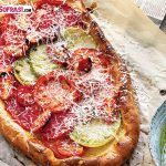 - Fesleğen yapraklarını zeytinyağı ile blender’den iyice geçirin. Açmış olduğunuz hamurun üstüne fesleğenli yağdan iyice sürün ve dilimlenmiş domatesleri düzgün şekilde yerleştirin. Kenarlarını katlayın ve yumurta sarısı sürün.