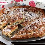 - Diğer hamuru elinizle tepsi büyüklüğünde açarak harcın üzerine yerleştirin. Üzerine zeytinyağı sürüp susam ve çörek otu serpin.