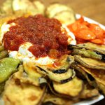 Ezilmiş sarımsak süzme yoğurda karıştırılarak, servis tabağının yanında kızarmış patlıcan, kabak ve biberler ile birlikte servis yapılır.