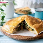- Hamuru iki eşit bezeye ayırın. Bir tanesini un serpilmiş tezgahın üzerine alın. Yemek tabağı büyüklüğünde açın. Hamuru yağlı kağıt serili fırın tepsisine yerleştirin. Kenarlarında boşluk kalacak şekilde salçalı patatesten yerleştirin. Salçalı patatesin üzerine de ıspanaklı iç malzemeden yerleştirin.