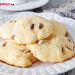 Kuru üzümleri ılık suda 15 dakika bekletin. Fırını 180 derecede ısıtın. Un, mısır unu, kabartma tozu ve tuzu bir kapta harmanlayın. Oda ısısında yumuşatılmış tereyağı ve şekeri bir cam kaseye alın. Mikserle çırpın. Yumurtaları ekleyip çırpmaya devam edin. Vanilyayı ilave edin. Kuru malzemeyi tereyağlı karışıma ekleyin. İyice karıştırın. Suyu süzülmüş kuru üzümleri ilave edin. Karışımdan birer yemek kaşığı dolusu alıp 2 santim aralıklarla yağlı kağıt konulmuş tepsiye dökün. Sıcak fırında 7-8 dakika pişirin. Iındıktan sonra servis yapın.