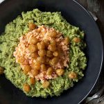 - Avokadoyu çatalla ezin. 1 diş havanda ezilmiş sarımsak ekleyip karıştırın. Avokadoyu servis tabağına ortası boş kalacak şekilde yayın. Ortasına hazırladığınız peynir ezmesini yerleştirin. En son zeytinyağında iyice kıtırlaşana kadar kavrulmuş nohutları serpin.
