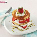 Un, kabartma tozu, vanilya ve şekeri bir kasede harmanlayın. Yumurta, süt ve eritilmiş tereyağını başka bir kasede çırpın. Un karışımını ekleyip iyice karıştırın. Yapışmaz yüzeyli tavayı ısıtın. Fırça ile çok hafif ayçiçeği yağı sürün ve hamurdan 2 yemek kaşığı kadar tavaya alıp önlü arkalı hafif kızarıncaya kadar pişirin. Hamur bitinceye kadar aynı işlemi tekrarlayın. Krema, şeker ve vanilyayı katılaşıncaya kadar mikserle çırpın. Çilekleri yıkayıp ince dilimleyin. Üç pankekin aralarına krema yayıp çilek dilimleri yerleştirerek üst üste dizin. Üzerini krema, çilek ve fıstık ile süsleyerek servis yapın.