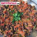 - Etin orta yerinden yer açarak soğanlar,sivri biberler ve doğranmış domatesler ilave edilir. ara ara karıştırılıp diriliği gidinceye kadar ve domateslerin bıraktığı su, buhar olup uçuncaya kadar kavrulur.