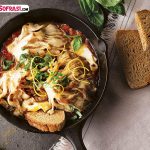 - Domatesler sos kıvamına gelince dilimlenmiş hellim peynirlerini aralarda boşluk kalacak şekilde yerleştirin. Peynirlerin üzerine de ızgara yaptığınız istiridye mantarlarını ekleyin.