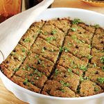 Karışımı yağlanmış fırın kabına alıp bastırarak yayın. Bıçak ile baklava dilim şeklinde keserek ortalarına birer top karabiber yerleştirin. 200 dereceye ayarlanmış fırında yaklaşık 25-30 dakika pişirin. Üzerine kıyılmış maydanoz serpip yanında yoğurtla birlikte servis yapın.