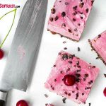 - Krema malzemelerini pürüzsüz olana dek blender’dan geçirip tabanın üzerine dökün ve kakao parçacıkları serpiştirin. Bez serili tezgaha kalıbı hafifçe vurdurarak, üstünün düzleşmesini sağlayın. Üstünü kapayın ve tamamıyla dondurun. Servis etmeden 15-20 dakika önce kalıptan çıkarın. Hazırladığınız vişneli kakaolu dondurulmuş pastayı dilimleyerek servis yapın.