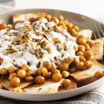 Haşlanmış nohut ve yemeklik doğradığınız soğanı zeytinyağında kavurun. Sebzeli çeşni ve tuz ile tatlandırıp ocaktan alın. Lavaş ekmeğini kare dilimleyip önceden ısıtılmış 180 derece fırında kızarana kadar pişirin. Kızaran lavaşları bir servis tabağına alıp üzerine nohutlu karışımdan ilave edin. Yoğurdu ayrı bir kasede çırpın. Ezilmiş sarımsağı ekleyip karıştırın ve nohutların üzerine gezdirin. Dolmalık fıstık ve kimyonla süsleyerek servis yapın.