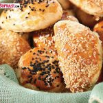- Poğaça hamurlarını yağlı kağıt serili fırın tepsisine yerleştirin. Üzerlerine kalan yumurta sarısını sürün,çörek otu ve susam serpiştirin.