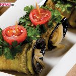 - Her patlıcan diliminin uç kısmına domatesli soğandan yerleştirin. Rulo şeklinde sarın ve birer kürdan batırın.