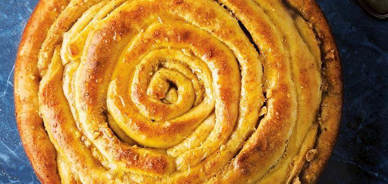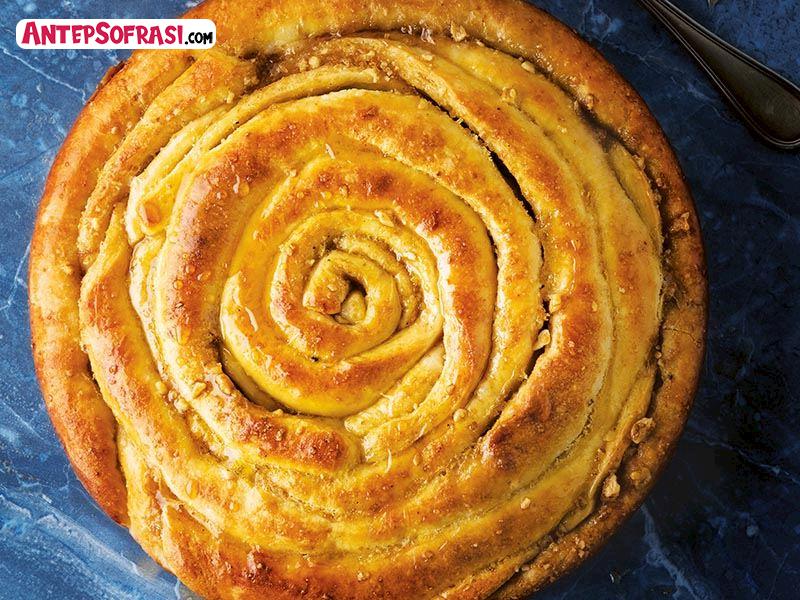- Hamuru 5 cm x 55 cm’lik 6 eşit şeride bölün. Bir şeridi sıkıca yuvarlayıp, başka bir şeridin ucunun üstüne koyup tekrar yuvarlayın. Büyük bir sarmal oluşturana kadar aynı işlemi tekrar edin. Pişirme kağıdı serdiğiniz 20 cm’lik bir kelepçeli fırın kabına yerleştirin. Streç filmle kaplayıp 30 dakika kabarması için bekletin.