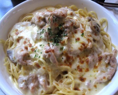 - Daha sonra servis tabağına alınarak üzerine mantarlı jambonlu beşamel sosu dökülür. Sıcak servis yapılır.
