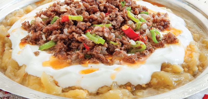 Patlıcanları yıkayın. Üzerlerini çatalla delip fırında ya da ocakta közleyin. Közlenen patlıcanların kabuklarını soyup ince doğrayın ve bir servis tabağına alın. Sarımsakları ezip süzme yoğurda ekleyin. Bizim Yağı bir sos tenceresinde eritin. Kıyma, salça ve ince doğradığınız biberleri ekleyin ve kıymanın rengi dönene kadar iyice kavurun. Tuz ve baharatlarla tatlandırın. Bir servis tabağına sırasıyla közleyip doğradığınız patlıcan, sarımsaklı yoğurt ve kıymalı harçtan koyup sıcak servis yapın.