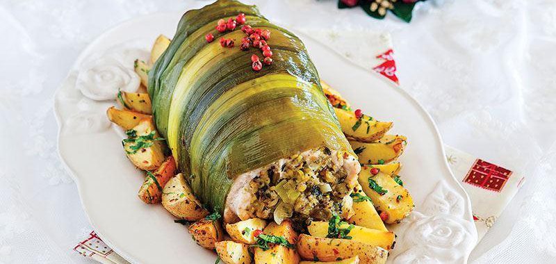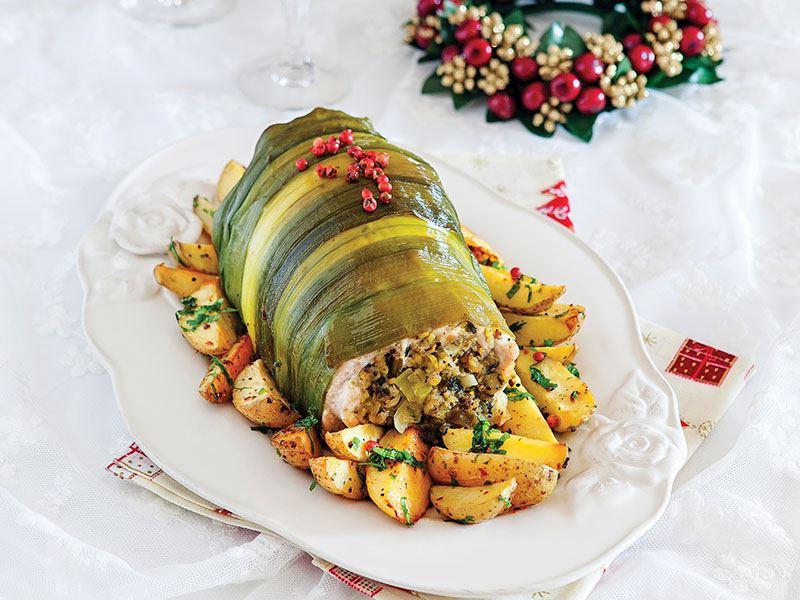Fırını 180 dereceye ayarlayın ve bir fırın tepsisine yağlı kağıt serin. Geniş bir tencerenin yarısına gelecek kadar su doldurup kaynatın. Derin bir kaseye buzlu su doldurun. Pırasaların yeşil yapraklarını uzun kesip saklayın. Beyaz kısımlarını kaynayan suda birkaç dakika haşlayın. Haşlanan pırasaları buzlu suya ekleyip birkaç saniye bekletin ve kağıt havlu üzerine alın. Zeytinyağını tavaya alıp ısıtın. Pırasaları ve kereviz sapını ince doğrayıp ekleyin. 3 dakika soteleyip 2-3 yemek kaşığı su ilave ederek pişirin. Tavayı ocaktan alıp ılındırın. Ufalanmış ekmek içi, sarımsak, Antep fıstığı, maydanoz, tuz ve karabiberi mutfak robotunda ezin. Pırasalı harca ekleyip karıştırın. İnceltilmiş hindi göğüs filetoyu yağlı kağıt üzerine alın. Üzerine pırasalı harcı yayıp rulo şeklinde sarın. Üzerine zeytinyağı sürün. Pırasaların yeşil kısımlarını hafifçe haşlayıp rulo hindi etinin üzerine sarın. Taze çekilmiş kırmızı tane biber serpin. Yağlı kağıt konmuş fırın tepsisine yerleştirip 180 derecede ısıtılmış fırında 40 dakika pişirin. Taze patatesleri elma dilimi şeklinde kesip zeytinyağı, tuz, kekik ve pul biberle harmanlayın. Fırın tepsisine alıp pişirin. Hindi ruloyu servis tabağına alın. Etrafına patatesleri ekleyip servis yapın.