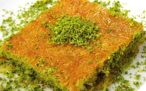 Kırılmış kadayıfın yarısı, tepsilerden birbirinin içine muntazam olarak yayılır. Bunun üzerine, Antepfıstığı içi, yine muntazam bir şekilde yayılır. Antepfıstığının üzerine kalan kadayıfın düzgün bir şekilde ve aynı kalınlıkta yayılır. Böylece altta ve üstte kadayıf tabakalarının arasında Antepfıstığı serpilmiş olur. Elin ayası ile kadayıfın üzerine hafif hafif bastırılarak kadayıf ve fıstık içinin kaynaşması sağlanmış olur.
