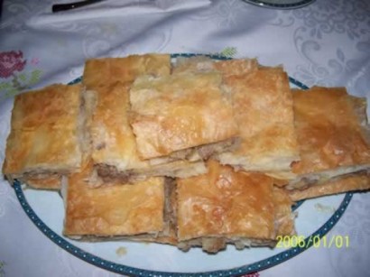 - Yoğrulan hamur ikiye bölünür, hamurlaran biri 12parçaya ayrılır, çay tabağı büyüklüğünde açılıp, yağlanır.Yarım saat dinlendikten sonra tepsinin ortasınakoyarak ,kenarlara doğru çekilerek açılır.İç malzemesi konur,sonra diğer 12 parçada aynı işlemle açılıp iç malzemelerinin üzerine konup kenarlardan sıkıştırılıp üzerine sıvıyağ sürülerek 175 derecede pişirilir.piştikten sonra üzerine tepsi kapatıp dinlendirilir.