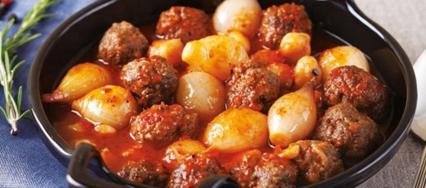 Bir tavaya sıvı yağ koyup kızdırın. İçerisine ilk olarak köfteleri ekleyip mühürleyin, ardından sırasıyla arpacık soğanları, sivri biberler, küp doğranmış mantarları ilave edip sularını salıp çekene kadar pişirin. Ardından zeytinyağı ve domatesleri ilave edin. Tavadan almadan önce de tereyağı ve kekiği ilave edip iyice karıştırın.