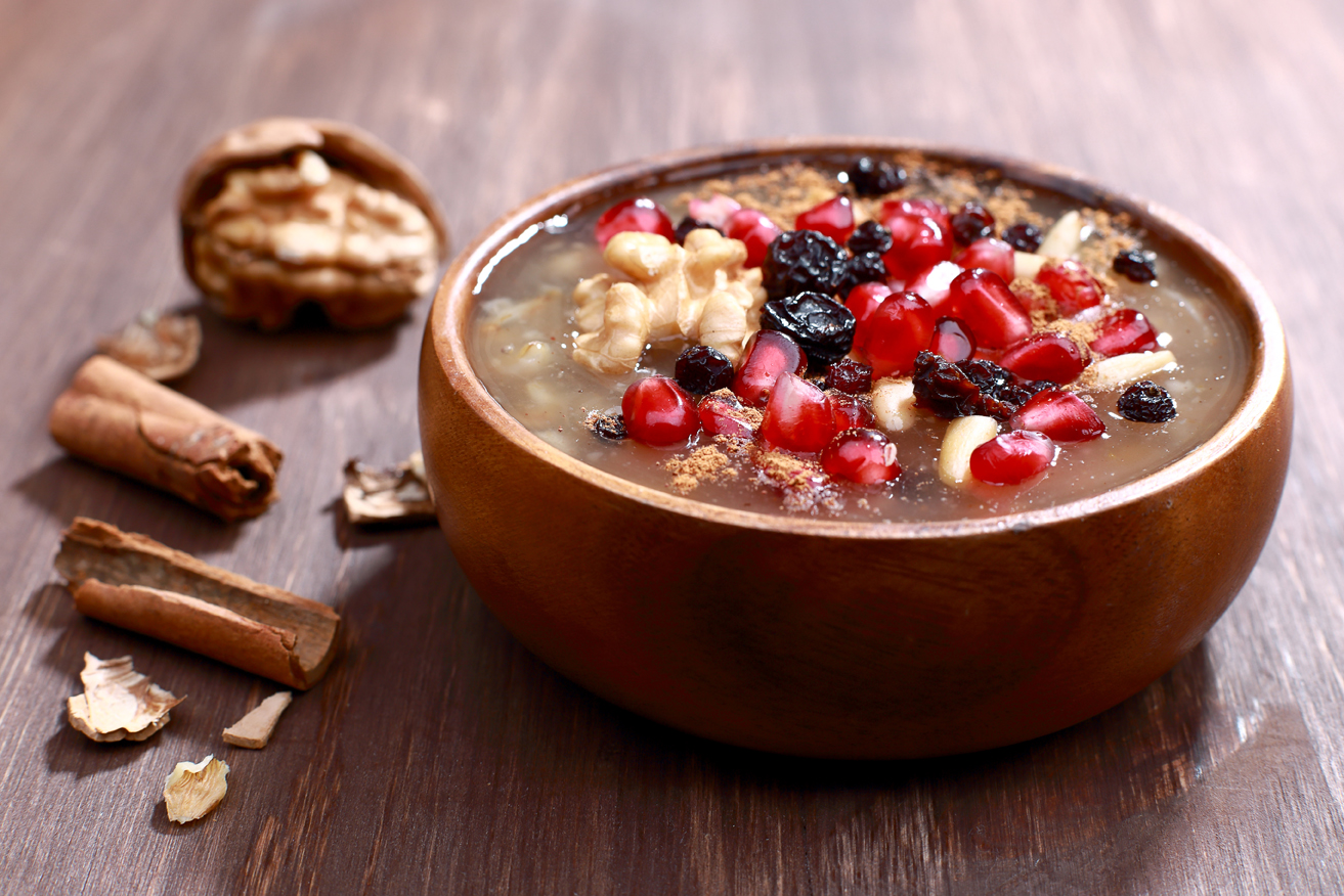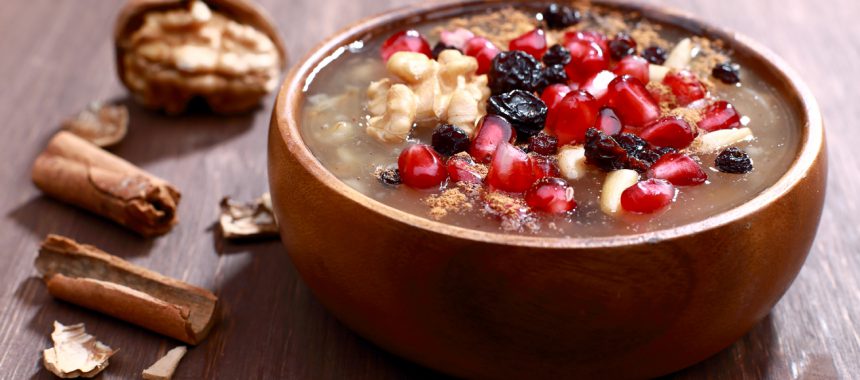 Aşure, üzerine dövülmüş rezene ve ceviz içi konarak servis yapılır.