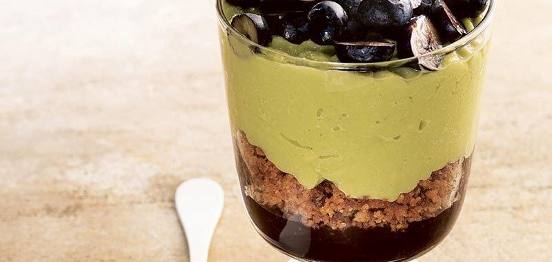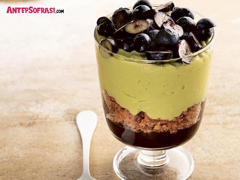 - Çikolata sos için, çikolatayı benmari usulü eritin ve krema ekleyerek iyice karıştırın. Avokado püresi için bütün malzemeleri blender’a koyun ve katı krema kıvamına gelene kadar çekin. Tatlıyı koyacağınız kabın içine önce çikolata sos, daha sonra crumble ve blender’dan geçirdiğiniz avokado püresini koyup servis yapın.
