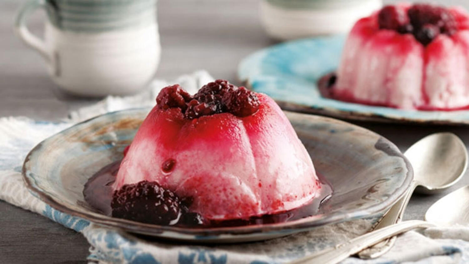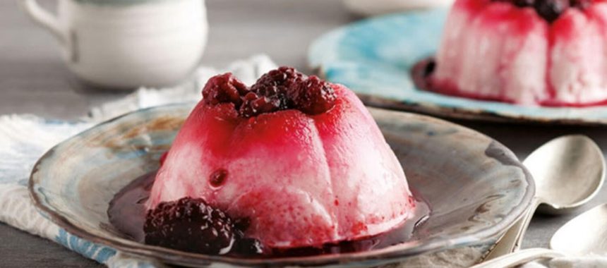 Meyve sosu için dondurulmuş orman meyvelerini bir sos tenceresine alın. Toz şeker ve suyu ekleyin. Şeker tamamen eriyip meyveler iyice yumuşayana kadar pişirin. Ocaktan alıp limon suyunu ekleyin. Ayranlı jöle için süt ve vanilya çubuğunu bir sos tenceresinde ısıtın. Vanilya çubuğunu çıkartıp ocaktan alın ve ılınmaya bırakın. Ilınan süte ayran ve toz jöleyi ilave edip jöle eriyinceye kadar bir mikser yardımıyla çırpın. Jöleli karışımı küçük servis kaplarına paylaştırın. En az 6 saat buzdolabında dinlendirin. Meyve sosu ile süsleyerek servis yapın.