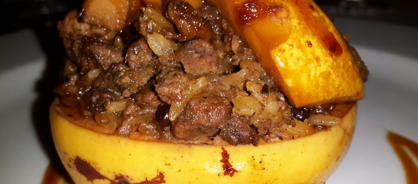 Şişe saplanmış ayva ve etler hafif sıkılarak birbirine yapışması sağlanır.