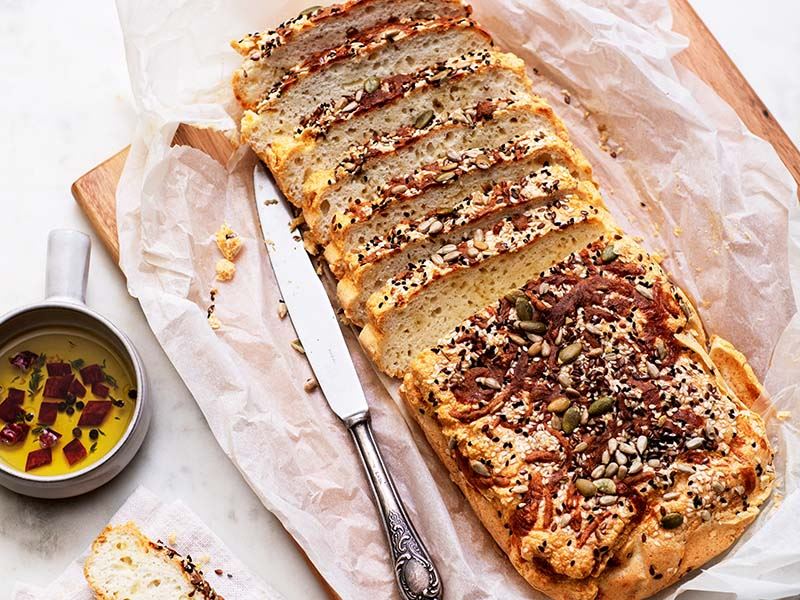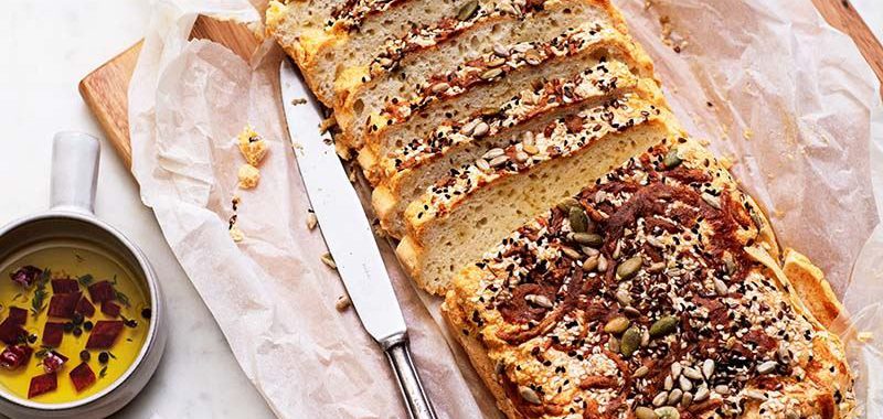 - Elde ettiğiniz karışımı yağladığınız herhangi bir kek kalıbına alarak üzerine çörekotu, ay ve kabak çekirdeği ile susamı ekleyin.