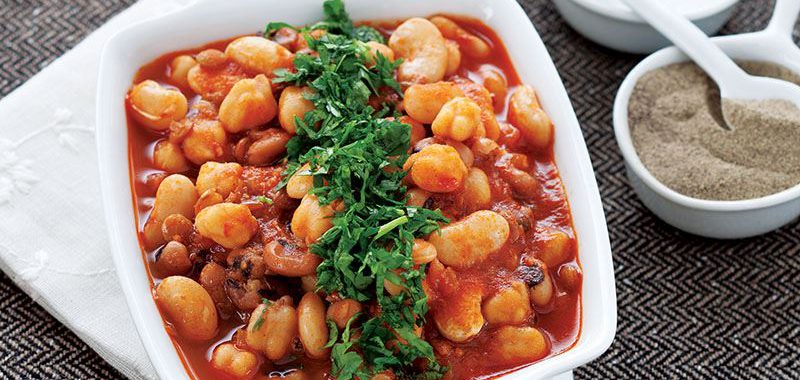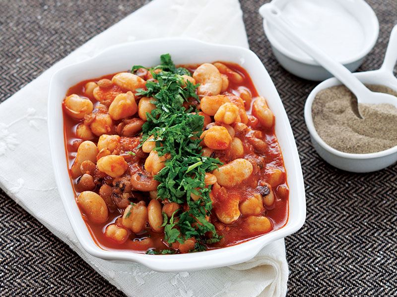Soğanı yemeklik doğrayıp zeytinyağında pembeleşinceye kadar kavurun. Rendelenmiş domates, sarımsak ve salçaları ekleyerek birkaç dakika yüksek ateşte pişirin. Haşlanmış mercimek, börülce, nohut ve fasulyeleri ekleyip 2 dakika pişirin. Tuz, karabiber ve üzerini geçecek kadar sıcak su ekleyin. 25-30 dakika pişirip servis tabağına alın. Maydanoz ile süsleyerek sıcak ya da ılık servis yapın.