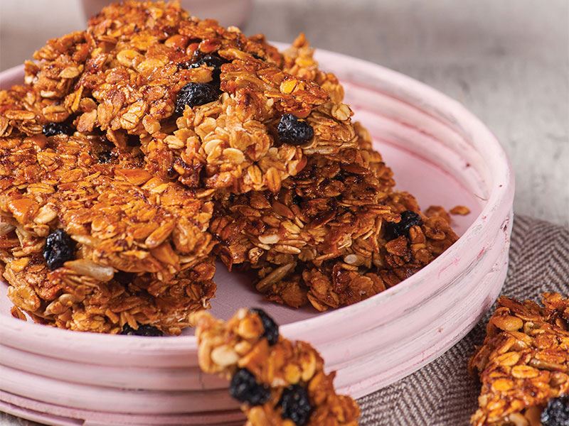 - Yulaf ezmesi, badem, yaban mersini kurusu ve ay çekirdeği içini bir karıştırma kabında harmanlayın. Elma püresi ve pekmezi küçük bir sos tenceresinde ısıtın. Balı ilave edip ocaktan alın. Ballı karışımı yulaf ezmeli karışımın üzerine gezdirin ve yulafları fazla ezmeden karıştırın.