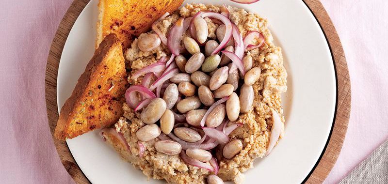 • Barbunya püresini servis tabağına aktarın. Zeytinyağını ısıtın, toz biberi ekleyip ocaktan alın ve hemen dip sosun üzerine dökün. Ay şeklinde doğranıp tuzla ovulmuş kırmızı soğanı ekleyin. Tereyağını bir tavada eritin ve ayırdığınız barbunyaları ekleyip birkaç defa çevirip ocaktan alın ve barbunya püresinin üzerine serpin. Taze kekik yaprakları serpip kızarmış baharatlı ekmekler ile servis yapın.