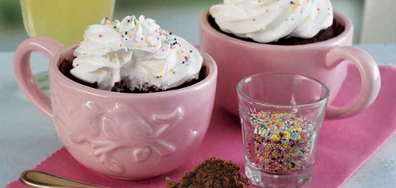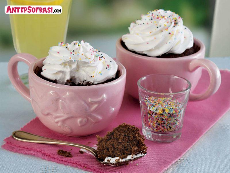 - Kek harcınızı mikrodalga fırına girebilen 2 çay fincanına paylaştırın. Mikroldalga fırına alıp yüksek ısıda 90 saniye pişirin. Çırpılmış krema ve pasta süsü ile süsleyerek sıcak servis yapın.