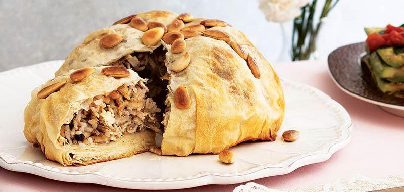 - Yağladığınız kalıba bademleri kaydırmadan iki yufkayı üst üste serin, kenarlarından sarksın. Üzerine pilavı dökün. Tüm yüzeye eşit dağılacak şekilde yayın. Yufkanın dışarı sarkan kısımlarından alıp ortasına doğru pirinçler gözükmeyecek şekilde kapatın. Üzerine yumurta sarısı ve eritilmiş tereyağı karışımından sürün. 180 dereceye ayarlı fırında, kontrollü olarak pişirin.
