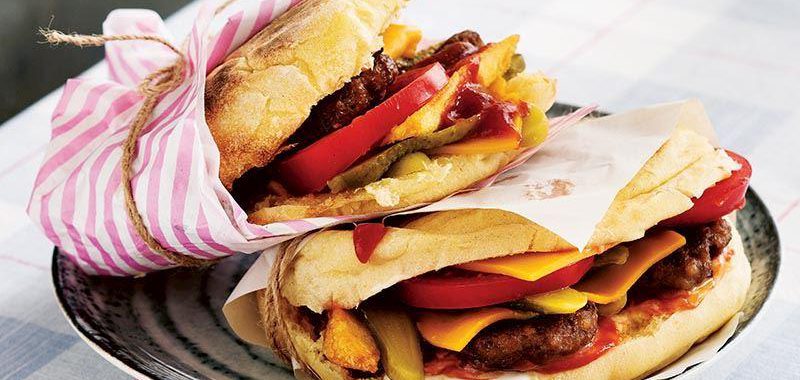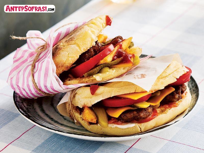 - Bazlama ekmeğini tost makinesinde bastırmadan hafifçe ısıtın. İçine ızgarada kızarttığınız köfteleri, dilimlenmiş domatesleri, kızarttığınız patatesleri, turşuları, çedar peynirini, ketçap ve hardalı ekleyerek tamamlayın.