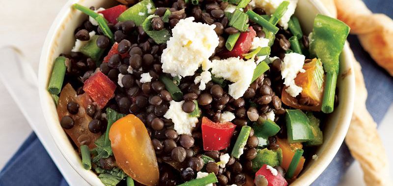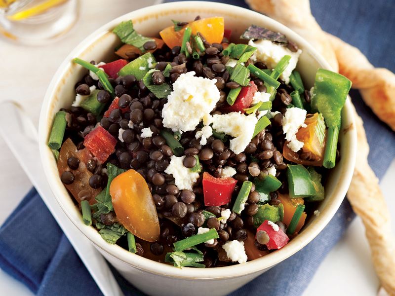 Haşlanmış beluga mercimeği geniş bir kaba alın. Küp doğradığınız biberler, domatesler ve ince kıydığınız yeşillikleri ilave edip karıştırın. Sosu için gerekli olan tüm malzemeyi bir kasede karıştırıp piyazın üzerine gezdirin. Tulum peyniri ile süsleyerek servis yapın.