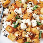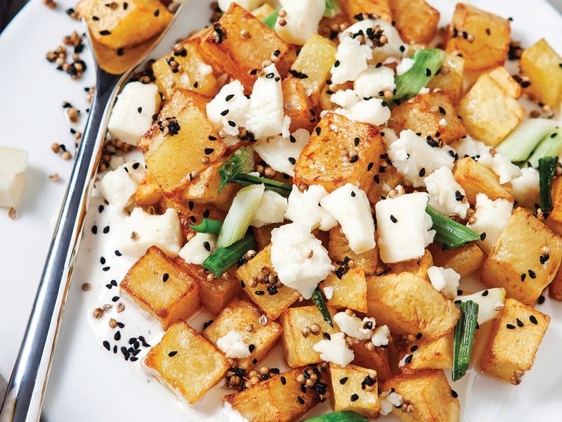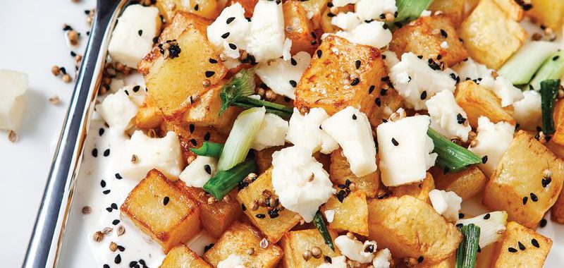 Patateslerin kabuklarını soyup küp doğrayın ve ısıttığınız ayçiçek yağında kızartın. Kağıt havlu üzerine alıp fazla yağını çektirin. Beyaz peyniri küp doğrayıp bir kaseye alın. İri kıydığınız taze soğan, çörek otu ve kişniş tohumunu ilave edip karıştırın. Peynirli harcı patateslere ilave edip karıştırın. Sıcak servis yapın.