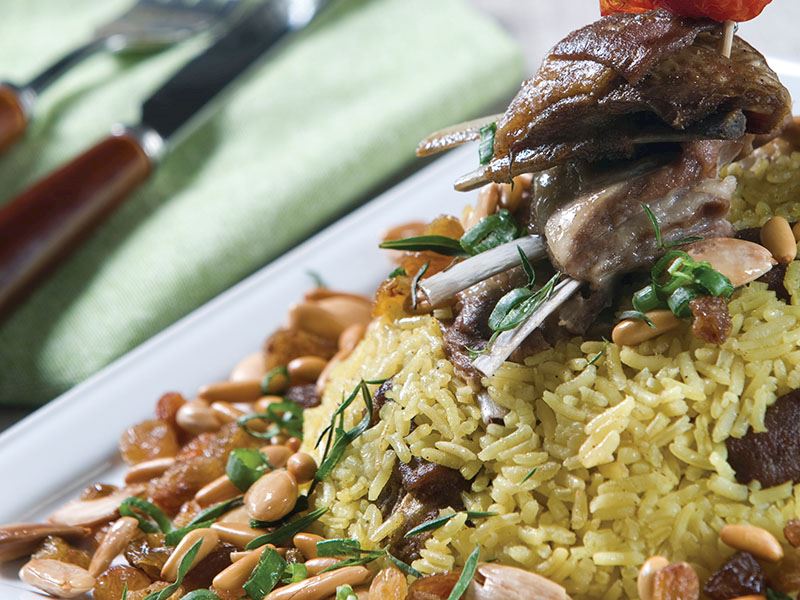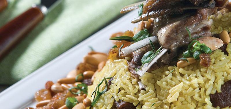 - 100 gr basmati pirinci 50 gr tereyağı 50 ml ayçiçeğiyağı 50 ml zeytin yağı 3 su bardağı et suyu 30 gr badem 50 gr kuru üzüm 25 gr dolmalık fıstık 250 gr kemikli kuzu kaburga eti 2 kiraz domates 2 frenksoğanı Bir kaç tel safran Yarım soğan Tuz