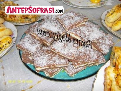 - BİSKÜVİLİ PASTA Malzemeler 1 paket sade, 1 paket kakaolu petibör bisküvi Kreması için 1 paket toz vanilyalı puding 2 yemek kaşığı un , 2 su bardağı süt Üzeri için1 poşet toz kremşanti Süslemek için Kakao, hindistancevizi Yapılışı 1paket pudingi normal arkasında yazan süt miktarını ekleyip ayrıca 2 su bardağı süt ve 2 yemek kaşığı un ilavesiyle pişirelim. Normal boyutta bir tepsiye bir kat sade bisküvi (şekerli suyla ıslanmış)dizip puding ilave edin.Sonra kakaolu bisküvi dizin.Pudingden dökün. Böylece iki çeşit bisküviyi puding dökerek aralarına sırayla bitirin. En üste 1 poşet çırpılmış toz krem şanti çırpıp sürelim.Kakao ve hindistan cevizi serpip dolapta bekletin.
