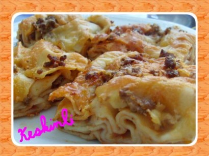 - Tepsiyi siviyag ile yaglayalim 1 sira lazanya hamuru döseyelim üzerine kiymali harctan yayalim sonra yine lazanya hamuru ve kiyma sonra yine 3 kat oluyor resimdeki paketten