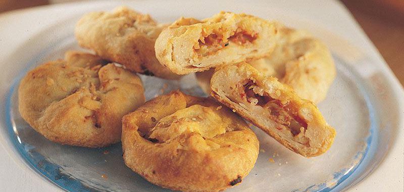 - Hamurların yarısını kabaklı, yarısını da patatesli iç malzemeyle hazırlayıp hafif yağlanmış tepsiye dizin. Önceden ısıtılmış 200 dereceye ayarlı fırında 20 dakika pişirin. Sıcak olarak servis yapın.