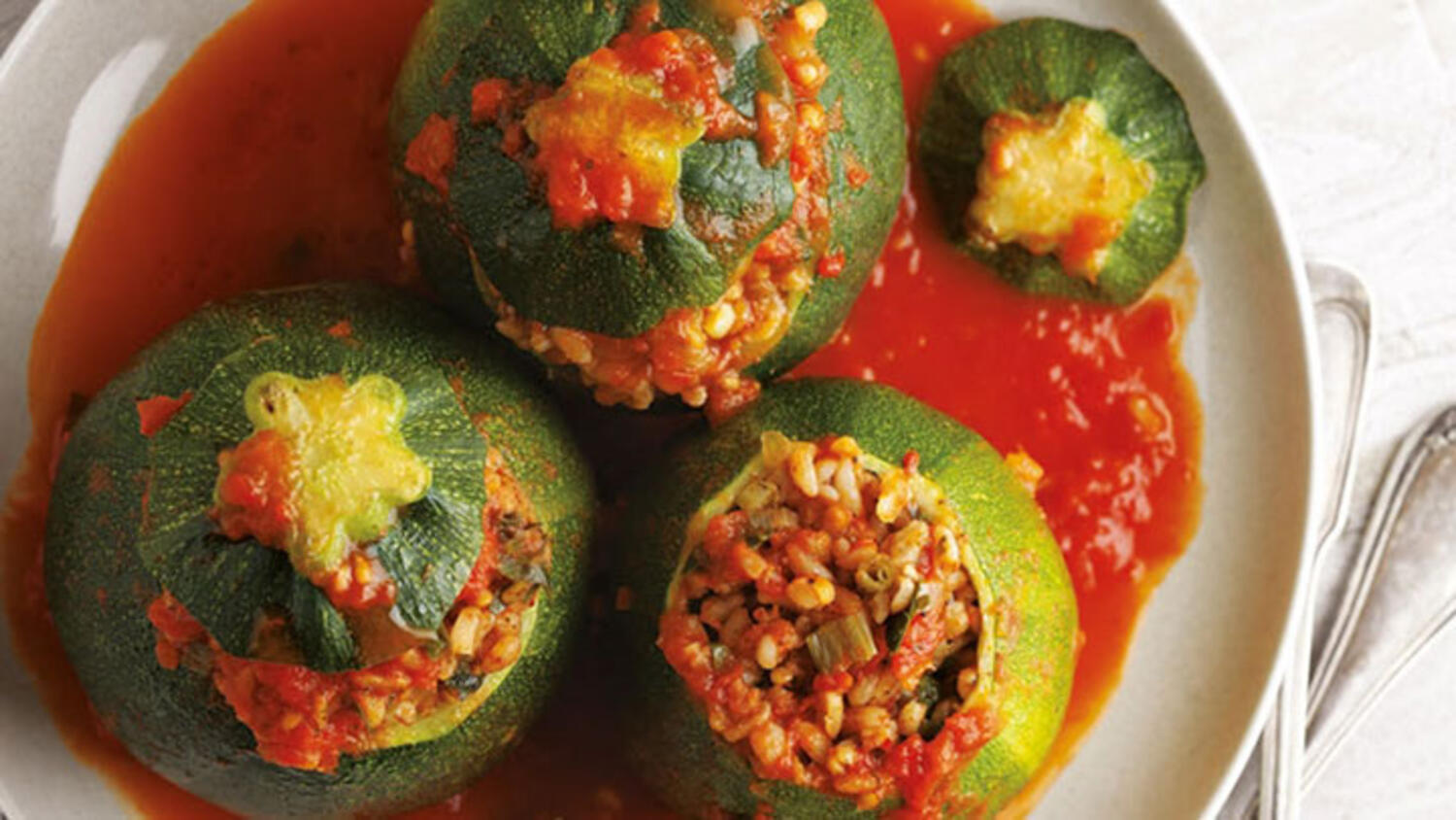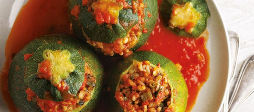 İç harcı için yemeklik doğradığınız soğanı zeytinyağında salçalarla beraber kavurun. Yıkayıp süzdüğünüz bulguru ekleyip 2-3 dakika kavurun. Su ve nar ekşisini ilave edin. Tuz ve baharatlarla tatlandırıp kısık ateşte bulgur suyunu çekene kadar pişirin. Kabakların sap kısımların birer parça kesip kapak yapmak için bir kenara ayırın. Kabakların içini bir tatlı kaşığı yardımıyla oyun. İç harcını bastırmadan kabakların içine doldurun. üzerini ayırdığınız kabaklarla kapatıp bir tencereye dizin. Sosu için domatesi rendeleyip bir kaseye alın. üzerine salça, tuz, kırmızı toz biber ve sıcak suyu ekleyip karıştırdıktan sonra dolmaların üzerine gezdirin. Kısık ateşte kabaklar yumuşayana kadar pişirin. Sıcak servis yapın.