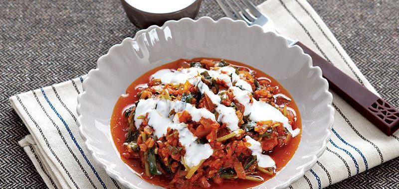 - Tuz ve kırmızı pul biber ekleyip kapağı kapalı olarak 5-10 dakika dinlendirin. Yemeği servis tabağına alıp üzerine sarımsaklı yoğurt gezdirin.