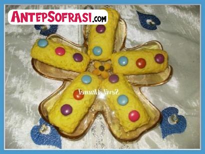 - hamurdan parçalar alarak ,içini ilave edip ,dikdörtgen şeklinde kapatıyoruz.üzerine renkli çikolatalı şekerlerle süslüyoruz.