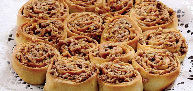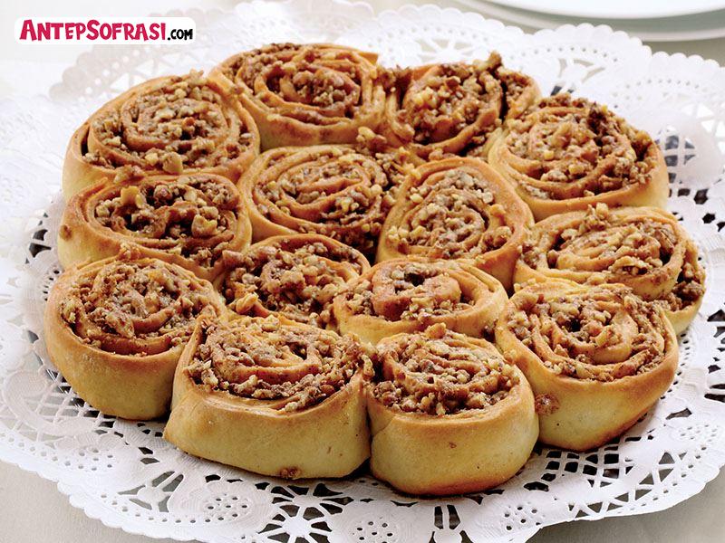 Mayalanan hamuru mutfak tezgahına alıp, 1 mm kalınlığında açın. Cevizli harcı bir kenarına yayıp, hamuru rulo şeklinde sarın. 3’er cm genişliğinde keserek, yağladığınız kelepçeli tepsiye yan yatırarak dizin. Mayalanması için 30 dakika bekletin. Önceden ısıtılmış 190 dereceye ayarlı fırında pişirin. Ilık servis yapın.