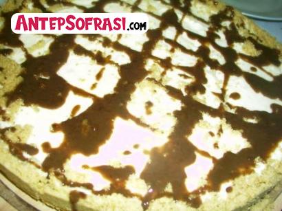 - Kremşantide 1 su bardağı sütle hazırlanarak soğumuş olan pudingle ve labne peyniri ile karıştırılıp dolaptaki bisküvinin üzerine dökülür ve donması için tekrar buzdolabına kaldırılır.