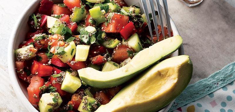 - Salatalık, domates, yeşil biber ve kapya biberi küp küp doğrayın. Chia tohumunu ekleyip harmanlayın.