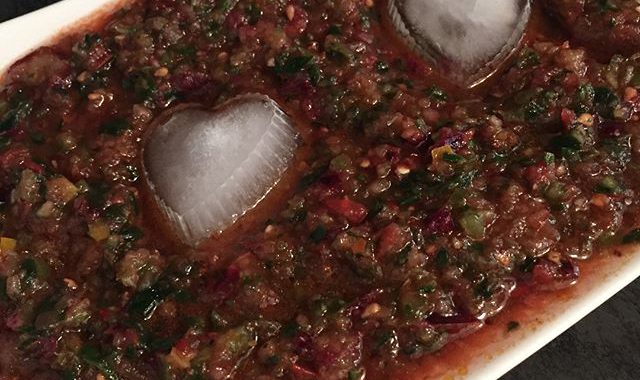 Üzerine 5 küp buz ilave edilen çiğ köfte salatası soğuk bir yerde muhafaza edilir ve çiğ köfte ile birlikte servis edilir.