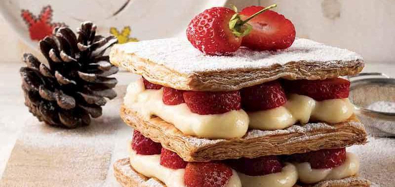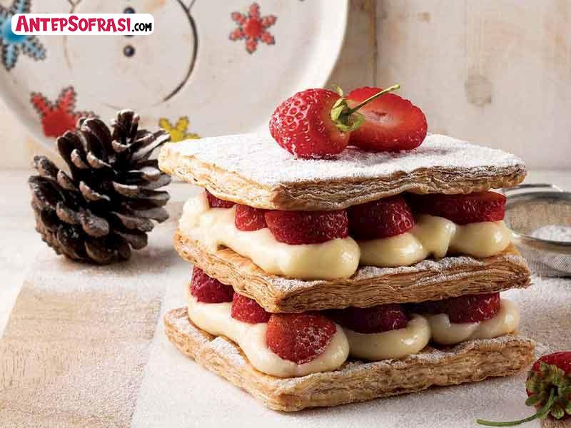 - Bir milföyü önünüze alın ve içerisine kremadan sıkın, üzerine ince dilimlenmiş çilek dizin. Ardından üzerine ikinci milföyü koyup yeniden krema sıkıp, çilek yerleştirin. Son olarak en üste bir milföy daha koyup pudra şekeri serperek servis yapın.